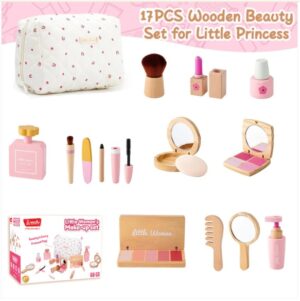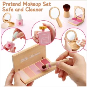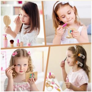 The set features wooden items such as a compact mirror, lipstick, eyeshadow palette, and makeup brush, all crafted from high-quality, durable wood and painted with vibrant, non-toxic finishes. Each piece is designed with smooth edges and child-safe materials, making it perfect for little hands.